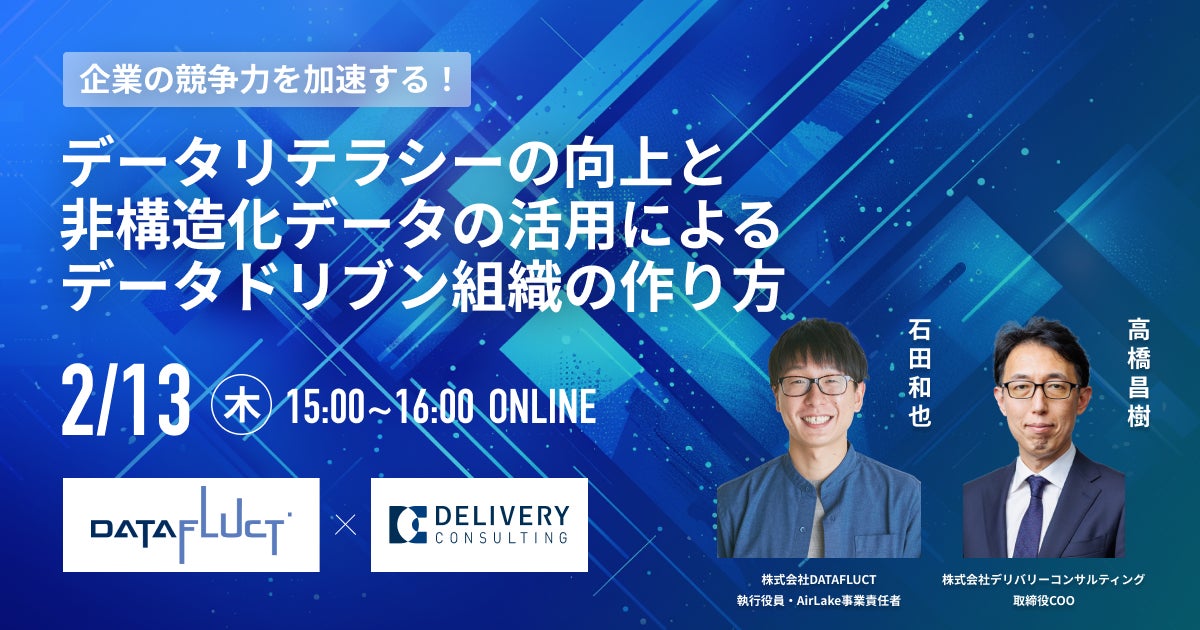 データリテラシーの向上や非構造化データの活用をテーマにしたWEBセミナーが2025年2月13日に開催されます。株式会社デリバリーコンサルティングと株式会社DATAFLUCTの共催による本オンラインセミナーは、企業の競争力をさらに高めたいビジネスパーソン必見の内容です。
