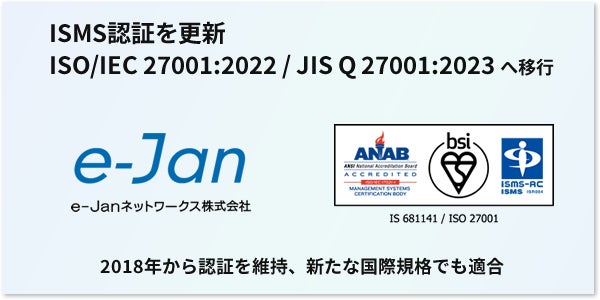 e-Janネットワークス株式会社は、情報セキュリティマネジメントシステム(ISMS)の認証を最新の国際規格「ISO/IEC 27001:2022 / JIS Q 27001:2023」へ移行し、認証の更新を完了しました。これにより、クラウドセキュリティを含む高度な情報セキュリティ体制の維持と強化が図られています。