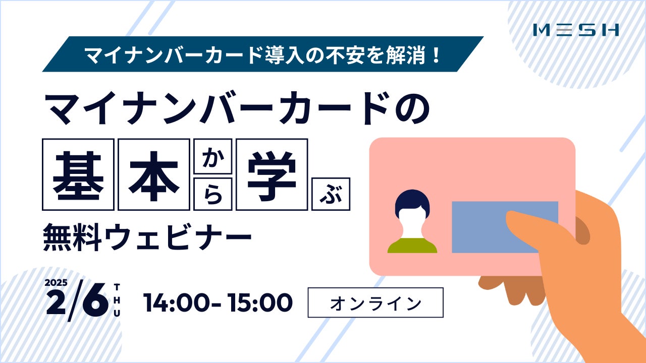 株式会社スタジオメッシュが主催する無料ウェビナー『マイナンバーカード導入の不安を解消!マイナンバーカードの基本から学ぶ無料ウェビナー』が2025年2月6日14時から開催されます。マイナンバーカードの基礎知識から企業での具体的な活用例まで、初心者でも安心して学べる内容です。参加費は無料で、事前申し込みが必要です。